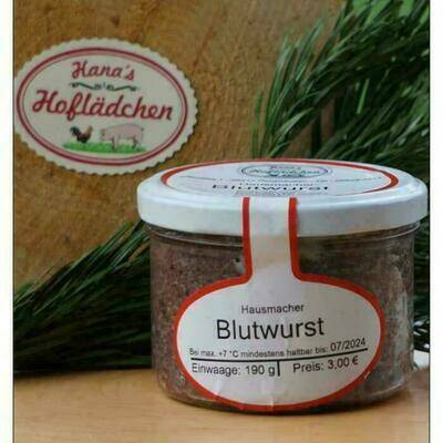 Schweinefleisch 65%, Schweinefett 20%, Schweineblut 5%, Zwiebeln, Selleriesalz E621, Gewürze, Nitritpökelsalz, Konservierungsstoff: Natriumnitrit